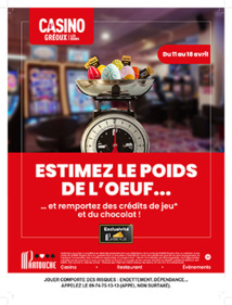 Entre le 11 avril et le 18 avril, rendez vous vite au casino pour estimer le poids de la pièce en chocolat qui sera exposée pour l’occasion. Mais attention, une petite difficulté amène du piment au jeu, puisque vous n’aurez pas le droit de toucher la pièce pour estimer son poids.