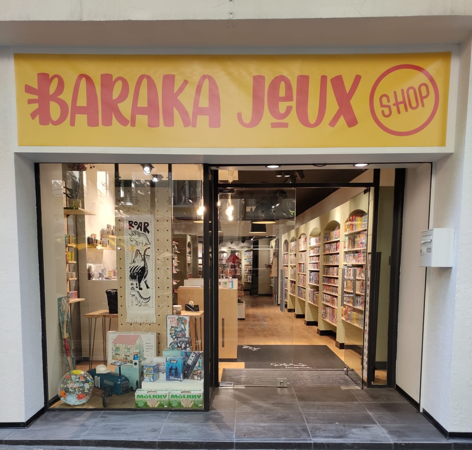 Baraka Jeux : Boutique de jeux de société, classés par catégories, on y trouve des jeux d’ambiance, classique, expert..., des jouets, des jeux d’ éveils (dès l’âge de 2ans ) des loisirs créatifs, des jouets d’imitation (vaisselle, cuisine, poupons) ainsi qu’une gamme de jeux de société d’apprentissage, avec des méthodes type Montessori.